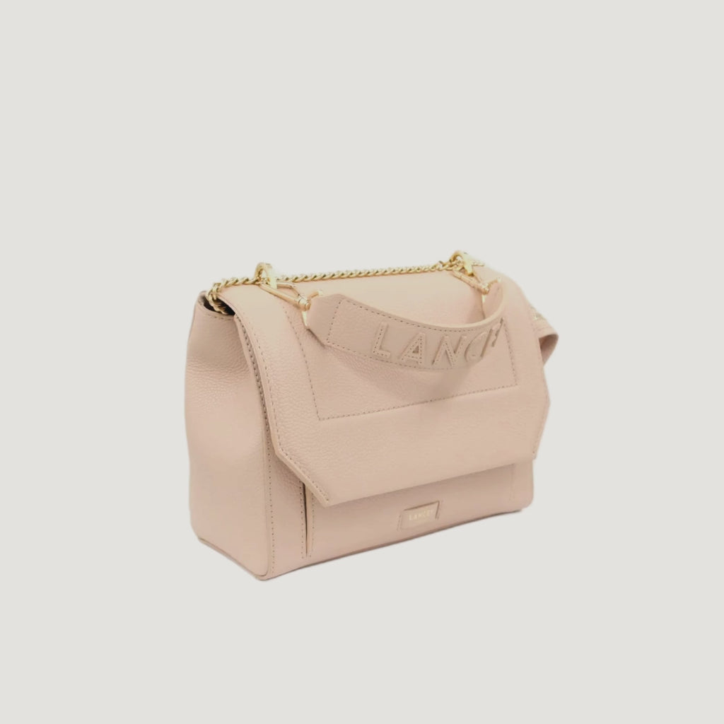 • -Grained cowhide leather -Flap bag -Textile lining -Detachable handle -One exterior patch pocket on the back -One exterior zipped pocket under the flap -One inside patch pocket -One inner zipper pocket -Hot-pressed "LANCEL" logo with gold finish -Sliding chain and leather shoulder strap -Made in Italy -REF:A092228BTU