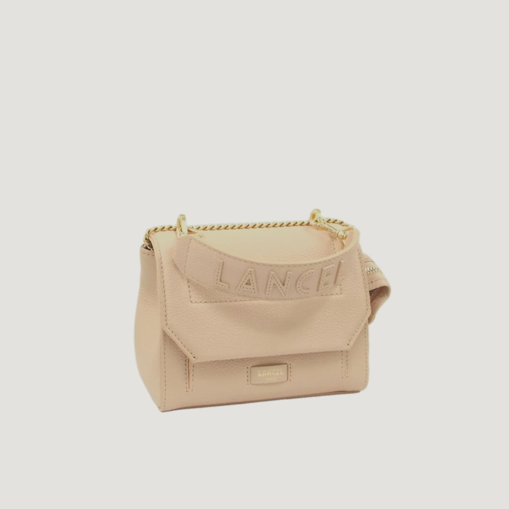 • -Grained cowhide leather -Flap bag -Textile lining -Detachable handle -One exterior patch pocket on the back -One exterior zipped pocket under the flap -One inside patch pocket -One inner zipper pocket -Hot-pressed "LANCEL" logo with gold finish -Sliding chain and leather shoulder strap -Made in Italy -REF:A092218BTU